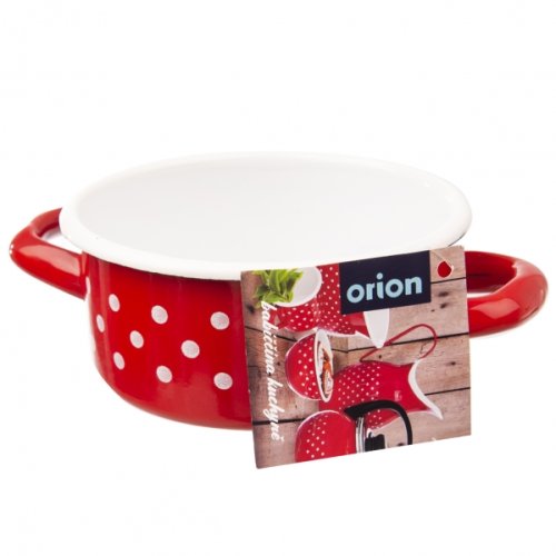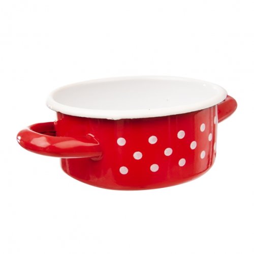 Smaltovaný kastról v červenej farbe s bielymi bodkami. Priemer 12 a výška 6 cm, objem 0.6 litra, šírka s uchami 19 cm. Vhodný na všetky typy platničiek vr. indukcia. EAN 8592381164324