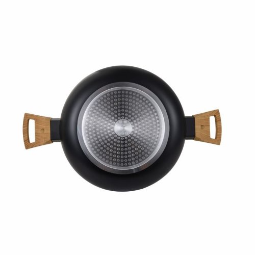 •28 cm hrniec so sklenenou pokrievkou. • Vyrobené z lisovaného hliníka pre rýchly nárast teploty. • Nepriľnav ý povrch ILAG Premium v čiernej farbe. • Indukcia s voštinovými vložkami, vhodná pre všetky druhy tepla. pokrievkou z kolekcie Bergner´s Earth Black je vyrobený z lisovaného hliníka a zaručuje rýchly rozvod tepla. Prémiový nepriľnavý povlak ILAG je obzvlášť odolný a vhodný na každodenné použitie. Vzhľadom na zloženie materiálu je pri varení v tomto kastróli bez PFOA, olova alebo kadmia nutné použiť iba malé množstvo tuku, perfektné pre zdravé varenie. Ergonomická drevená rukoväť s mäkkým úchopom a tepelne odolná proti popáleniu. Základňa s indukčným bodom je vhodná pre všetky sporáky ako je indukčný, plynový, sklokeramický, halogénový a elektrický. Ľahko sa čistí, na povrchu sa nelepia potraviny a na predĺženie životnosti výrobku sa odporúča ručné umývanie.