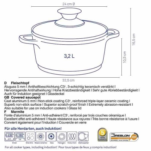 - materiál: tlakovo liaty hliník - vnútorný keramický povrch GREBLON C3 + - priemer: 16 cm - výška: 8 cm - hrúbka steny: 5 mm - objem: 1 l - sklenená pokrievka - vhodná pre všetky typy ohrevov vrátane indukcie - séria: …