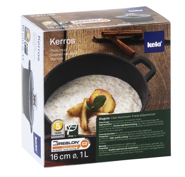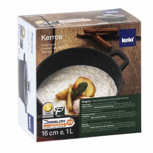 • materiál: tlakovo liaty hliník - vnútorný keramický povrch GREBLON C3 + - priemer: 16 cm - výška: 8 cm - hrúbka steny: 5 mm - objem: 1 l - sklenená pokrievka - vhodná pre všetky typy ohrevov vrátane indukcie - séria: Kerros - značka: KELA - záruka 5 rokov Kerros s steny 5 mm. Zvláštny znak kvality: 6 hviezdičkový nepriľnavý povrch GREBLON-C3+. 3-vrstvová, keramikou plnená teflónová vrstva sa vyznačuje vynikajúcou anti-adhéznym efektom, vysokou odolnosťou proti poškriabaniu a veľmi dobrou odolnosťou proti oderu.