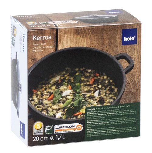 • materiál: tlakovo liaty hliník- vnútorný keramický povrch GREBLON C3+- priemer: 20 cm- výška: 9 cm- hrúbka steny: 5 mm- objem: 1,7 l- sklenená pokrievka- vhodná pre všetky typy ohrevov vrátane indukcie- séria: Kerros- značka: KELA- záruka 5 rokovKerros hrúbkou steny 5 mm. Zvláštny znak kvality: 6 hviezdičkový nepriľnavý povrch GREBLON-C3+. 3-vrstvová, keramikou plnená teflónová vrstva sa vyznačuje vynikajúcou anti-adhéznym efektom, vysokou odolnosťou proti poškriabaniu a veľmi dobrou odolnosťou proti oderu.