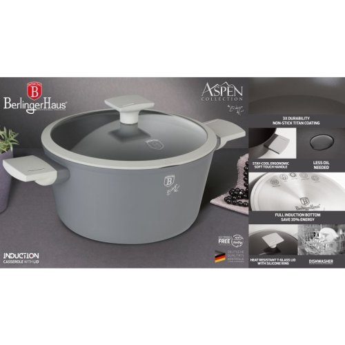 Univerzálny kastról s titánovým povrchom v šedom dizajne Aspen Collection. Moderný minimalistický dizajn kastróla vás určite zaujme hneď na prvý pohľad. Matný šedý povrch kastróla je navyše veľmi praktický pri dlhodobom používaní. Vnútorná vrstva je potiahnutá 3-vrstvovým titánovým povrchom, ktorý je charakteristický svojou dokonalou nepriľnavosťou. Pripravované pokrmy sa tak nepripaľujú a vďaka tomu sa kastról veľmi ľahko čistí. Zároveň je vhodný na zdravé varenie s minimom tuku alebo oleja, v závislosti na použitých surovinách pokojne aj bez jedinej kvapky tuku. Titánový povrch, rovnako ako ostatné použité materiály, neobsahujú žiadne škodlivé látky, varenie je tak úplne zdravé a hygienické. Zosilnené Turbo indukčné dno z nerezovej ocele je kompatibilné so všetkými druhmi varných dosiek a spoľahlivo funguje aj na indukcii. Iste oceníte tepelne izolovanú rukoväť, ktorá sa pri varení nezahrieva a zostáva stále chladná. Kastról Aspen je vhodný na každodenné varenie, dusenie aj vyprážanie, perfektne bude vyzerať aj pri servírovaní hotových jedál priamo na váš stôl.