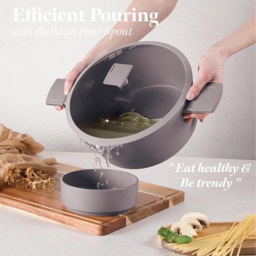 - Materiál: kovaný hliník s nepriľnavým povrchom titanPro- Rozmery: pr. 28*12,4 cm 6,1 l- Farba: matná taupe- Trojvrstvový odolný nepriľnavý povrch titánPro- Ergonomická rukoväť a gombík s mäkkým dotykom …