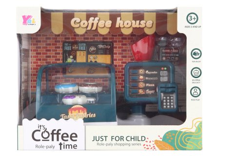 Plastová kaviareň s pokladňou, chladničkou s tromi donutmi a ďalšími doplnkami. Rozmer balenia cca 30 x 23,5 x 12 cm. Vek 3+