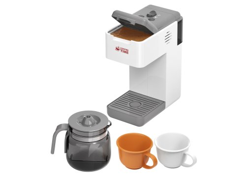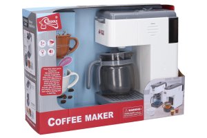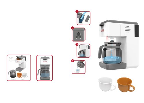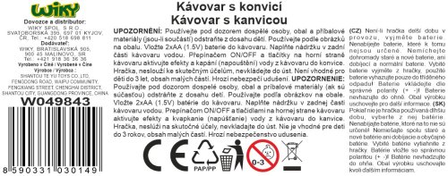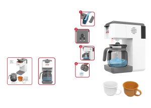 Kávovar s kanvicou a tečúcou vodou. Rozmery 20x9x20cm. 2xAA batérie nie sú súčasťou. svetelné a zvukové efekty. obsahuje kávovar, kanvicu a dva hrnčeky. Po naplnení kávovaru vodou do nádržky hore vzadu kávovar napúšťa vodu do kanvice. tlačidlo on/off. Obrázkový návod na obale.