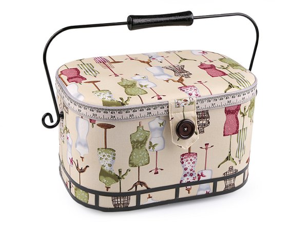 Košík na šijacie potreby vo vintage štýle nadchne nielen krajčírky a pletařky, ale aj ďalších kreatívnych nadšencov. Do čalúneného košíka s potlačou ružičiek sa vám zmestí plno šijacích potrieb. Vnútri sa nachádza praktické odnímateľné poschodie z priehľadného plastu, ktoré má 1 veľkú a 6 malých priehradok. Vo veku sú 2 textilné vrecká a okrúhly ihelníček. Košík sa zapína na magnetický patent, má kovové madlo s drevenou rukoväťou na pohodlné prenášanie. Dole sú 4 nožičky v tvare guličiek.