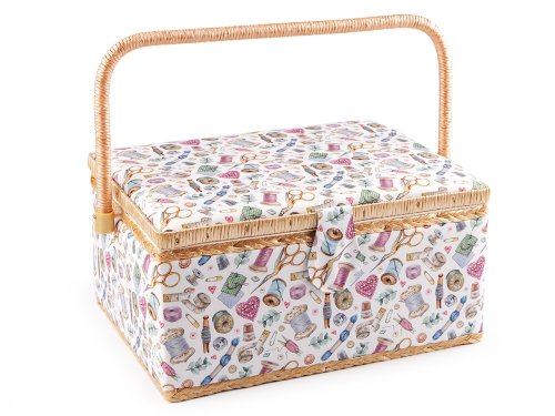 Väčší čalúnený košík na šijacie potreby ocení každá krajčírka. Na poťahu sú motívy šijacích potrieb. Na vnútornej strane veka má košík ihelníček a vrecko. Ďalej má k dispozícii plastové medziposchodie s množstvom priehradiek, do ktorých si možno šijacie potreby usporiadať. Poschodie sa dá ľahko vybrať. Výška medziposchodia je 3 cm. Košík má zapínanie na magnet. Vďaka kvalitnému pevnému uchu ho môžete ľahko preniesť.