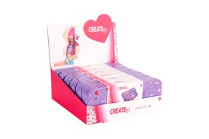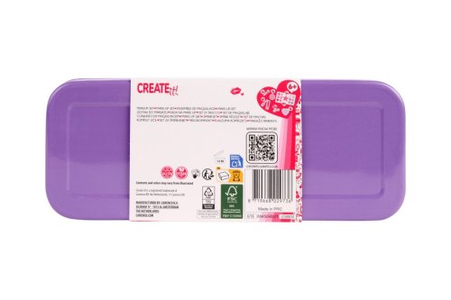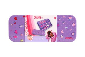 Kazeta s líčením v kovovej krabičke rozkladacia - trojposchodová. Poschodia obsahujú - 10 druhov očných tieňov, tvárenku, 6 druhov leskov na pery, 2 štetce na nanášanie tieňov, 2 štetce na nanášanie lesku na pery, 1 štetček na nanášanie tvárenky, gumičku do vlasov a zrkadlo v tvare srdiečka.