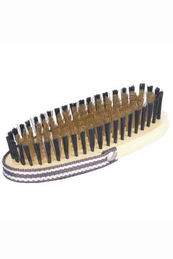 Drevený oválna kefa na ruku s mosadznými drôtikmi uprostred je určený na úpravu srsti malých zvierat.