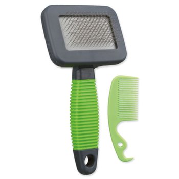 Plastová kefa s kovovými drôtikmi a hrebienkom na čistenie.