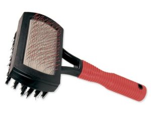 Obojstranná kefa s gumovou rukoväťou, kovovými drôtikmi a nylonom na vyčesávanie línajúcich chlpov.