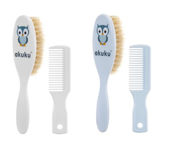 Kefka a hrebienok s prírodným vlasom Akuku. Vyrobené bez BPA. Rozmery: hrebienok: cca 11 cm, kefka: cca 15 cm. Vhodné pre deti od narodenia.