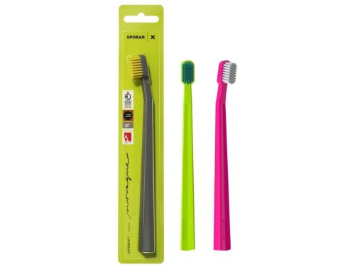Prémiový rad zubných kefiek Spokar X je navrhnutý na základe aktuálnych odporúčaní stomatologických odborníkov, jedinečný dizajn je výsledkom hľadania optimálneho držania kefky s cieľom ľahkej manipulácie a perfektného vyčistenia zubov. Hlava kefky je veľmi husto osadená vysoko kvalitnými jemnými vláknami so zaoblenými koncami, tieto vlákna účinne odstraňujú zubný povlak a sú šetrné k ďasnám. Supersoft má viac ako 3500 vlákien.