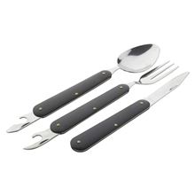 Skladacia kempingová príborová sada z nerezovej ocele s hliníkovými držadlami, 300D polyester Vrátane vidličky, noža a lyžice v čiernom obale Rozmer: 11 x 7 x 2 cm