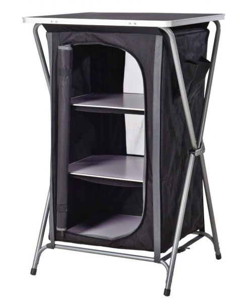 - prenosná kempingová skrinka s policami - možno kompletne zložiť na plocho do transportného obalu - perfektná na cestovanie, ako kempingový nábytok aj na chatu - hliníková konštrukcia s pracovnou doskou z MDF …
