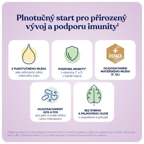 1 Obsahuje 1,1 g mliečneho tuku na 100 ml pripraveného mlieka. 2galaktosyllaktóza je oligosacharid materského mlieka, patriaci do skupiny HMO (Human Milk Oligosaccharides) a prirodzene sa vyskytujúci v materskom mlieku. 3Z mikrorias Schizochytrium sp. 4Esenciálne mastné kyseliny (ALA a LA) sú potrebné pre normálny rast a vývoj detí. Priaznivý účinok možno dosiahnuť pri príjme 2 g kyseliny α-linolénovej (ALA) a 10 g kyseliny linolovej (LA) denne. 5Vitamíny A a C prispievajú k normálnej funkcii imunitného systému. 6Vápnik je potrebný pre normálny rast a vývin kostí u detí. 7Certifikované. Geneticky modifikované zložky/suroviny (podľa legislatívy) neboli použité v žiadnej fáze výroby potraviny vrátane kŕmenia pre hospodárske zvieratá, od ktorých sa mlieko získava.
