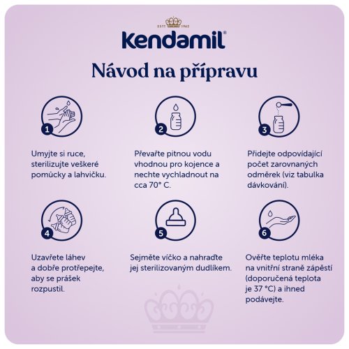 Dôležité upozornenie: Dojčenie je najlepší spôsob výživy Vášho dieťaťa. Kendamil Premium 4 HMO+ je určený na výživu malých detí od ukončeného 24. mesiaca a mal by tvoriť iba súčasť ich zmiešanej a vyváženej stravy. Pri kŕmení z fľaštičky zabráňte nepotrebnému predlžovaniu kontaktu cumlíka so zúbkami, zvyšujete tým riziko zubného kazu. Starajte sa o hygienu ústnej dutiny dieťaťa, predovšetkým pred spaním. Dodržujte pokyny na prípravu, kŕmenie a skladovanie, inak ohrozíte zdravie dieťaťa. Nie je určené pre deti do 12 mesiacov.