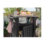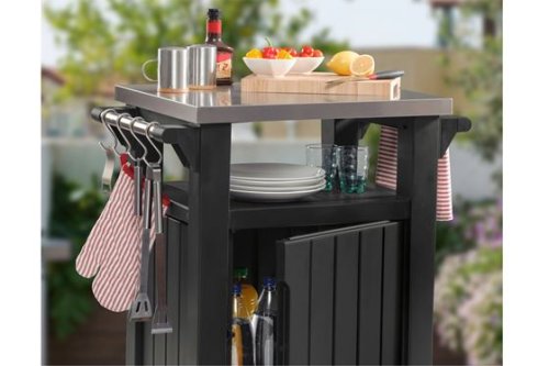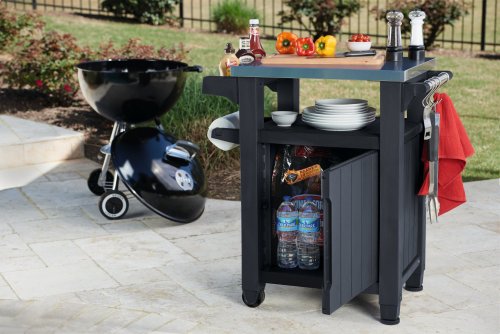 Grafitový grilovací stolík Unity značky Keter má kapacitu 105 litrov. Nerezová pracovná doska , praktická rukoväť s háčikmi na zavesenie utierok a kolieska na premiestňovanie stolíka dohromady vytvárajú dokonalé prostredie pre vonkajšie grilovanie.
