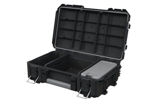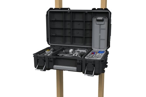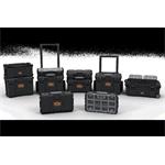 Kufor na elektrické náradie ROC Pro Gear 2.0 je robustný a vždy pripravený do práce. Obsahuje odolné západky, očko na visiaci zámok (zámok nie je súčasťou dodávky) a tesnenie IP65. Vnútorný malý organizér a dve prepážky Vám umožnia mať vo vybavení prehľad a poriadok. Systém držiakov Pro Mount, ktoré sú súčasťou dodávky, ponúka funkciu Hang-and-Work na praktické zavesenie.