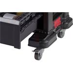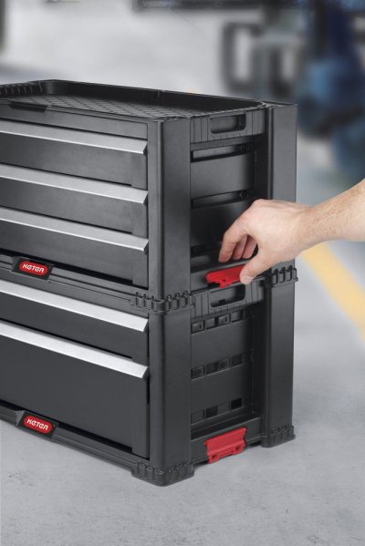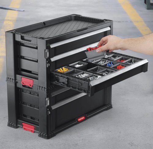 5zásuvková skrinka na náradie na otočných kolieskach. Obsahuje hlbokú zásuvku s vyberateľnými prepážkami na väčšie a ťažšie náradie. Ďalšie 4 zásuvky na iné náradie, príslušenstvo a menšie predmety. Každá sada je vybavená 16 vyberateľnými boxmi. Praktická polica s veľkým objemom, ktorá umožní uložiť náradie rôznej veľkosti do praktických priehradok. Výrobok disponuje 5 objemnými zásuvkami, čo umožňuje zoskupovanie predmetov. Hlboká zásuvka s vyberateľnými prepážkami uľahčuje skladovanie väčších a ťažších nástrojov. Ostatné 4 zásuvky sú určené na iné nástroje, menšie predmety a doplnky. K polici je priložených 16 vyberateľných boxov na náradie, určených na skladovanie menšieho príslušenstva.