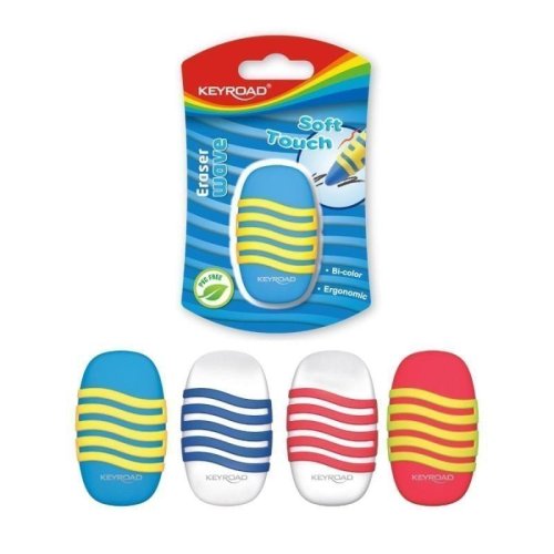 Dvojfarebná guma s dizajnom vlniek. Ergonomický tvar s mäkkým úchopom. Tvar umožňujúci presné obojstranné použitie. Perfektný výsledok gumovania. Dodávané v mixe 4 farebných prevedení. Dodávané na blistri. Rozmer každej gumy 5,8 x 3,4 x 1 cm.