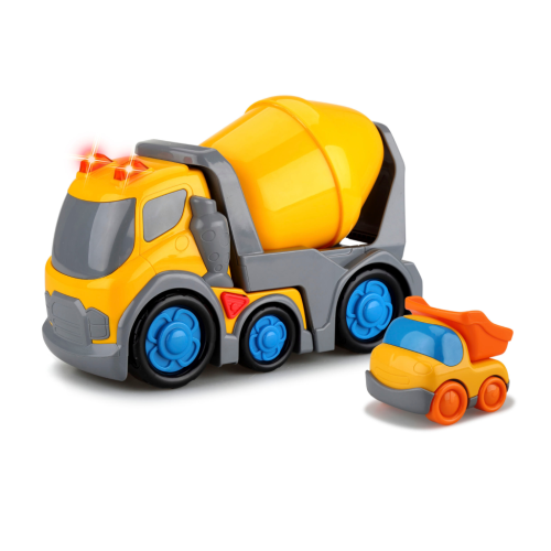Kiddy Go! Miešačka s efektmi. Balenie obsahuje auto o veľkosti 31 cm a malé autíčko. Miešačka ponúka svetelné a zvukové efekty pre väčšiu zábavu. Efekty sa aktivujú stlačením tlačidla na streche kabíny. Náves s miešačkou je možné otáčať. Kolieska na voľnobeh. Auto vyžaduje 2xAA batérie, sú súčasťou. Vhodné pre deti od 18 mesiacov.
