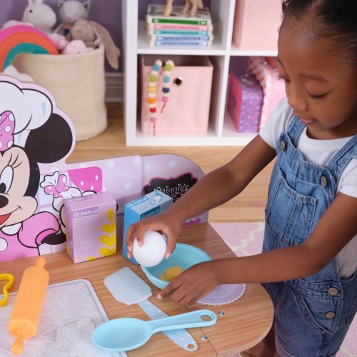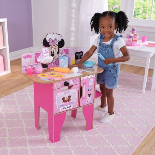 Myška Minnie je pripravená podať pomocnú ruku a pripraviť nejaké sladké dobroty v tejto ružovej hracej kuchynke od KidKraft. Minnie Mouse kuchynka umožňuje kuchárom vyskúšať si pečenie, váľanie cesta, vykrajovanie sušienok a varenie v rúre. Ruka myšky Minnie v bielej rukavici slúži ako polička na kartičku s receptom. Vďaka otočným gombíkom a spotrebičom, ktoré sa otvárajú a veľkému pracovnému priestoru, si deti užijú veľa zábavy.