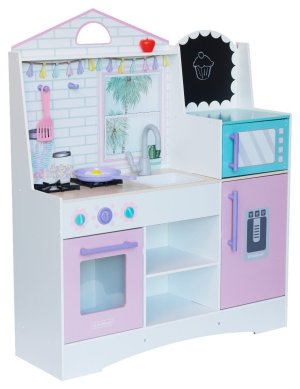 Detská kuchynka Dreamy Delights v príjemnej kombinácii bielej a pastelových farieb je vyrobená prírodného materiálu. Obsahuje varné platničky s dvoma ovládacími gombíkmi, ktoré pri otáčaní cvakajú, mikrovlnku, chladničku a rúru. Na tabuli nad mikrovlnku môžu malí kuchári namaľovať svoje kulinárske výrobky. Všetko potrebné môžu mať po ruke vďaka dvom vešiačikom nad platničkami. Rozmery kuchyne: 94 x 35 x 114 cm. Vhodné pre deti od 3 rokov.