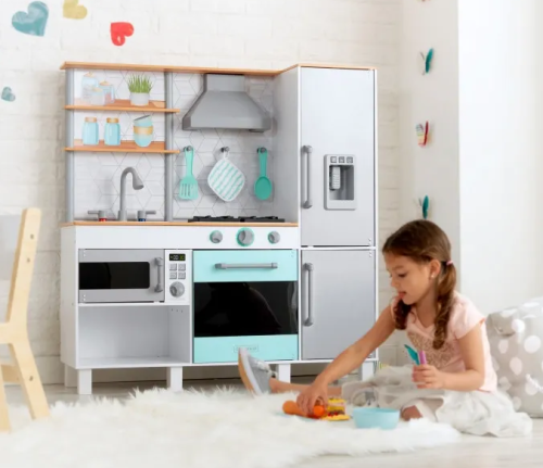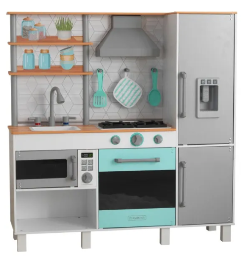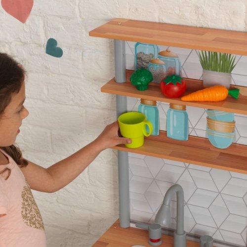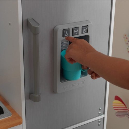 kuchynka má priestrannú chladničku s možnosťou výroby ľadu, veľkú mrazničku a mikrovlnu s priehľadnými a otváracími dvierkami mimoriadne veľká rúra a sporák, u ktorého je možné otáčať gombíky súčasťou je drez, u ktorého sa deti môžu naučiť rozpoznávať horúcu a studenú vodu podľa farby kohútika a chňapka majú vlastné háčiky nad varnou doskou priestranné police nad drezom uľahčujú organizáciu skladovania technológie EZ Kraft Assembly™ uľahčuje skladanie kuchynky rozmery kuchynky: 101 x 33 x 105 cm vhodné pre deti od 3 rokov