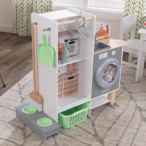 Z jednej strany kuchynka, z druhej práčka so šatníkovou skriňou - táto drevená zostava od značky Kidkraft určite nadchne každú malú gazdinky.