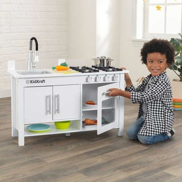 Varte ako profesionáli, čisto a s eleganciou. Vo výbave kuchynky nájdete drez s užitočnou sprchou na flexibilnom ramene, veľký multifunkčný sporák so štyrmi horákmi, rozmerný úložný priestor opatrený slušivými dvierkami a roztomilé krájacie doštička. Dvierka rúry sú vybavené vitrínou, ktorú môžete obdivne nazerať na pripravované jedlá. Otáčanie gombíkov obsluhy sporáka sprevádza cvakavé zvuky poskytujúce odozvu a dodávajúce hrám na uveriteľnosti. Výrobok vyžaduje montáž, dodávané s detailným návodom na zostavenie. Hlavné vlastnosti: drez, multifunkčný sporák a krájacia doštička otvárateľné dvierkarozmerný úložný priestorodolná konštrukcia