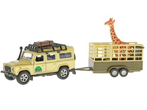 Hurá do Afriky na zebry a žirafy s bezpečným autom Land Rover Defender. Auto je kovové, 14cm dlhé a na spätný chod. Jeho súčasťou je odpojiteľný príves o veľkosti 14cm na prepravu zvierat.