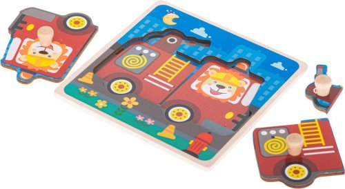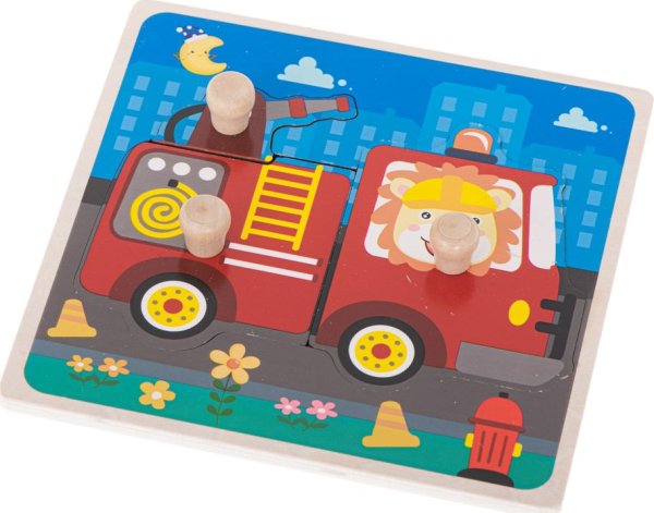 Drevená vkladačka s obrázkom hasičského vozidla. Dieliky sa od seba tvarovo líšia, čo znamená, že by s ich priradením nemali mať problém ani tí najmenší.
