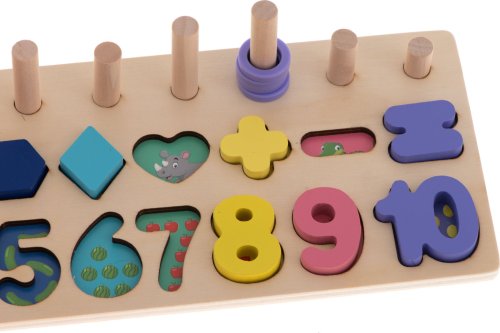 priraďujte geometrické tvary a čísla s podkladovými obrázkami 10 zvislých kolíčkov pre farebné krúžky zodpovedajúce číslu rovnakej farby výborne podnecuje predstavivosť, podporuje kreatívne myslenie a skvele rozvíja manuálne zručnosti deti sa učia zábavnou formou farby, tvary, čísla a základy matematiky všetky prvky boli vyrobené tak, aby sa deťom pri hre nedostali do rúk triesky