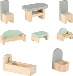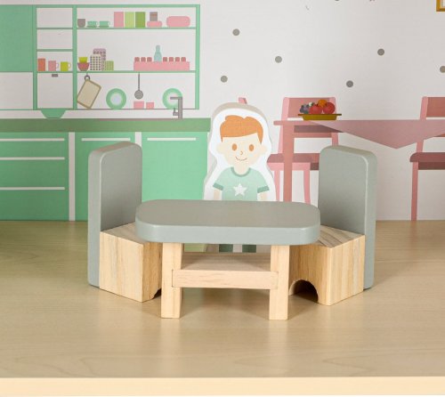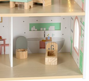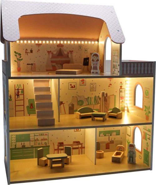 vstavané LED osvetlenie, kompletné vybavenie - vrátane nábytku do kuchyne, obývacej izby, kúpeľne i spálne, súčasťou sú dve figúrky, jednoduchá montáž, rozvíja jemnú motoriku a koordináciu rúk pri premiestňovaní nábytku, podporuje sociálne zručnosti prostredníctvom hrania s postavičkami, pomáha s rozvojom fantázie a tvorivosti vďaka možnosti meniť usporiadanie interiéru inteligenciu, na prevádzku sú potrebné 3ks batérie typu AA batérie (nie sú súčasťou balenia).