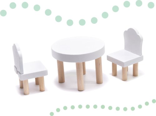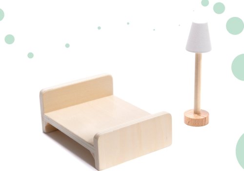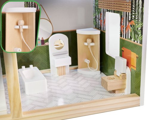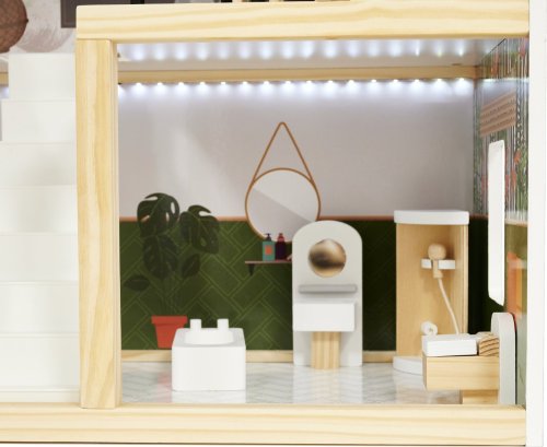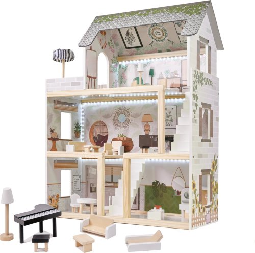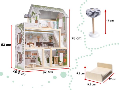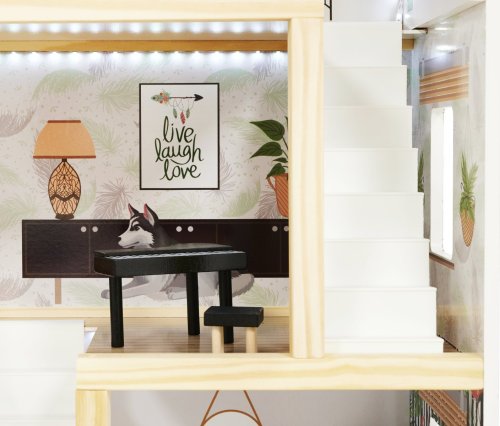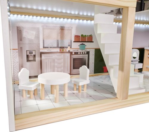 Moderný vzhľad. Tri poschodia s priestrannými izbami (kuchyňa, kúpeľňa, obývacia izba, spálňa) a terasou. Z poschodia na poschodie vedie schodisko. Vybavený miniatúrnym nábytkom z dreva. Osvetlený pomocou LED pásikov . Drevené časti boli vyrobené tak, aby sa deťom pri hre nedostali do rúk triesky. Domček zaručí nielen zábavu, ale bude aj skvelou dekoráciou do detskej izby.