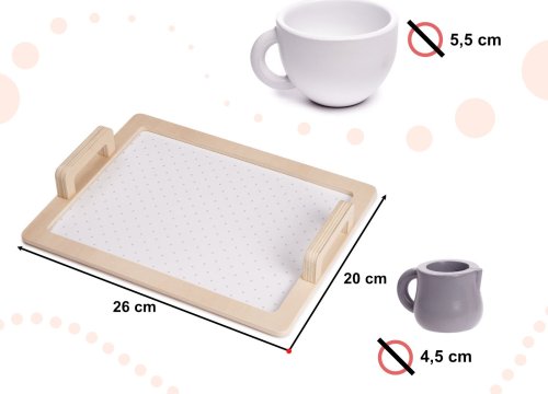Set obsahuje: 2 šálky, 2 podšálky, tácku, džbán s vekom, cukorničku, kanvičku na mlieko, 2 šišky, 2 kávové lyžičky, 2 čajové lyžičky Rozmery tácky: 26 x 20 x 4 cm