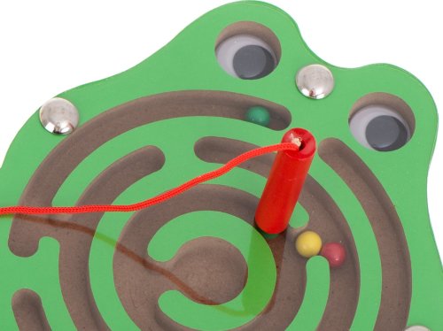 Magnetický labyrint Žaba poteší každé dieťa a nabáda k hre. K žabke je pripevnený magnetický stylus na povrázku, s ktorým sa guličky budú pohybovať. Navyše, aby bola úloha ťažšia, môžu byť guličky vedené bludiskom otáčaním žabky v rôznych smeroch.