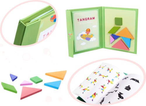 Zaujímavá hlavolamová hra vhodná predovšetkým na cesty. Usporiadajte jednotlivé dieliky na magnetickú plochu tak, aby utvorili rôzne vzory. Až 96 vzorov na usporiadanie, ktoré pomáhajú rozvíjať logické myslenie. Buďte kreatívni – vymýšľajte svoje vlastné vzory a tvary. Podporuje kreativitu a jemnú motoriku. Tangram je nápomocný aj pri učení názvov farieb.