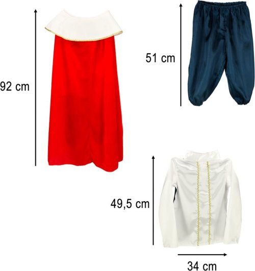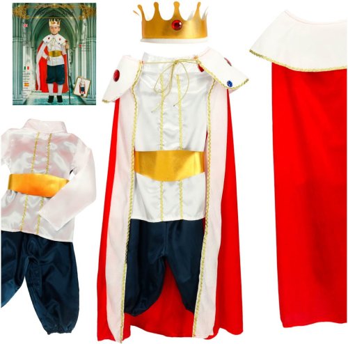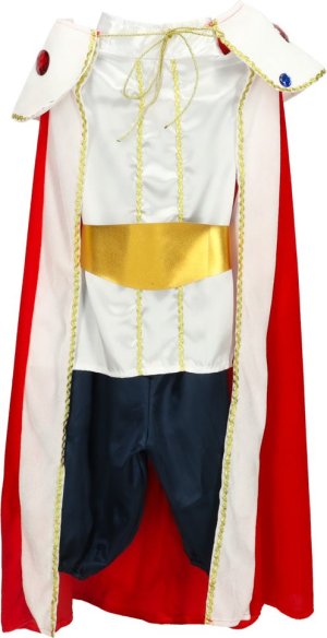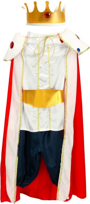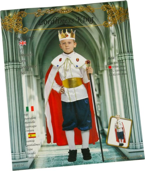 Kostým vo veľkosti M (110-120 cm). Sada obsahuje: košeľu, nohavice, plášť, opasok a kráľovskú korunu.