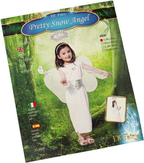 Detský kostým vo veľkosti S (100-110 cm). Sada obsahuje: šatôčky, krídla, opasok a čelenku so svätožiarou