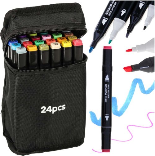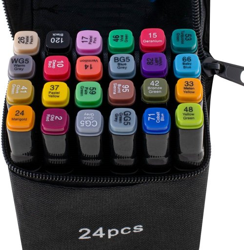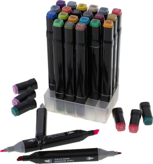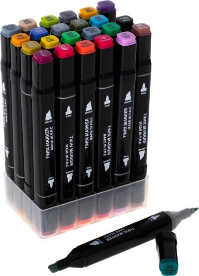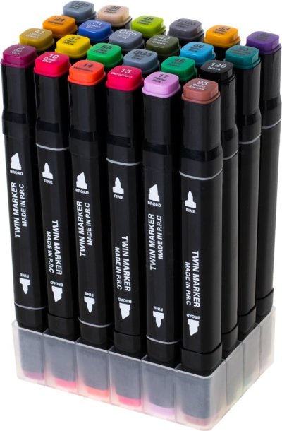 Súprava 24 fixiek v rôznych farbách a plastový stojan pre jednoduché uloženie. Vlastnosti: