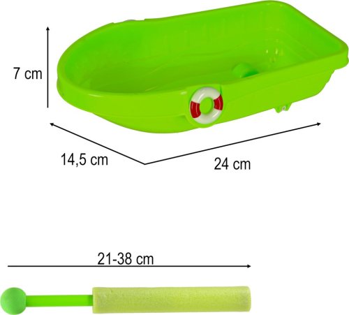 Rozmery vodnej pištole: 21–38 cm × 3 cm Dĺžka hrablí: 14,5 cm Rozmery loďky: 24 cm × 14,5 cm × 7 cm