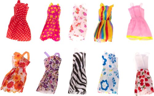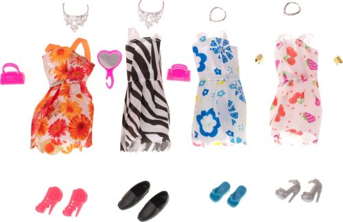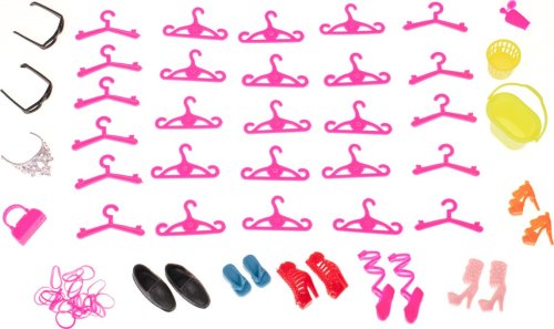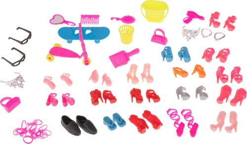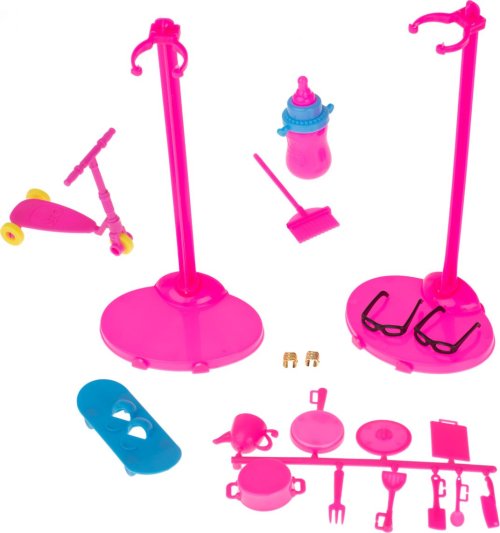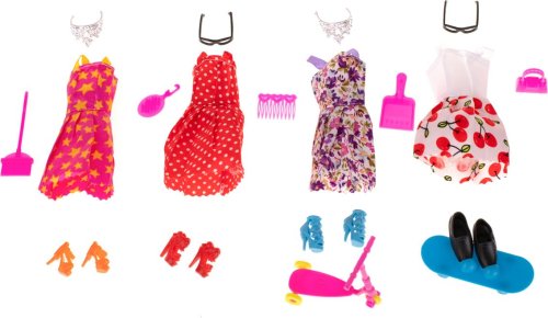 Sada obsahuje: 10 ks šiat pre bábiky (dĺžka 13 cm), okuliare, kabelky, črievičky, topánky, korunky, vešiaky, kolobežku, skateboard, príbory ai.