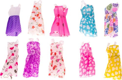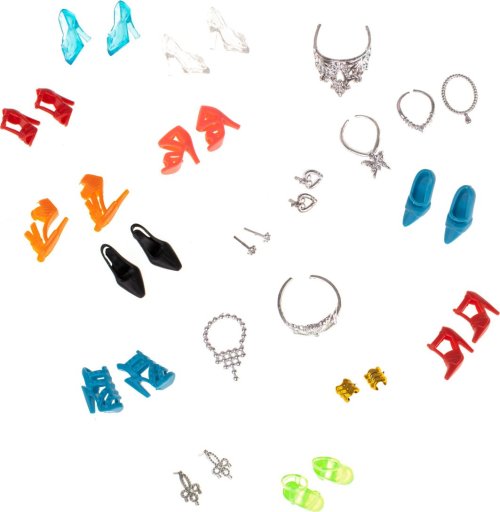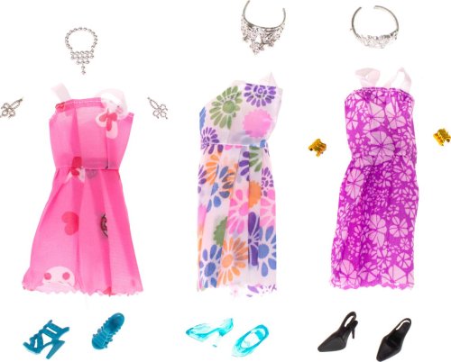 Sada obsahuje: 10 ks šiat pre bábiky (dĺžka 13 cm), črievičky, kabelky, korunky ai.