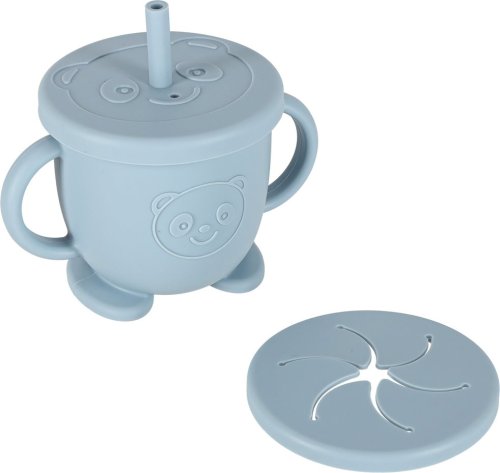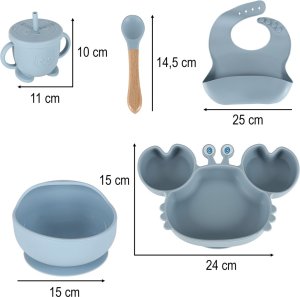 silikónový tanier v tvare kraba s prísavkou, silikónová miska s prísavkou, hrnček s dvoma viečkami (vrátane viečka so slamkou), silikónová lyžička a vidlička, prvá detská lyžička a vidlička, silikónový nastaviteľný podbradník.