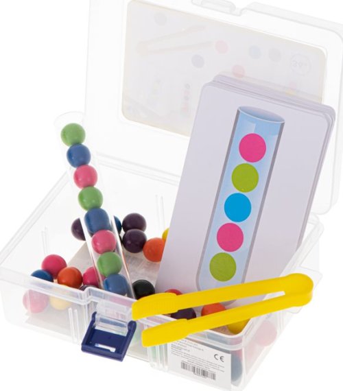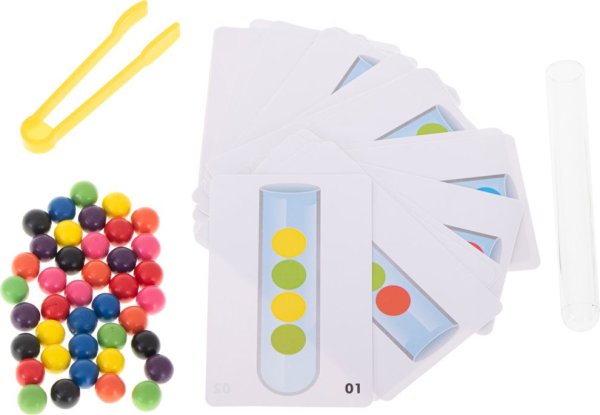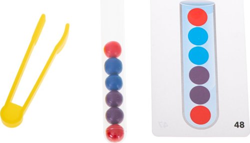 Cieľom tejto jednoduchej hry je roztriediť guličky do skúmavky pomocou rúk alebo pinzety, ktorá je súčasťou balenia. Inšpiráciu poskytne 24 obojstranných kariet so vzormi, podľa ktorých deti usporiadajú guličky do skúmavky. Úloha sa môže zdať jednoduchá, ale spočiatku to bude určite výzva. Použitím pinzety zlepšíte manuálne zručnosti vášho dieťaťa.