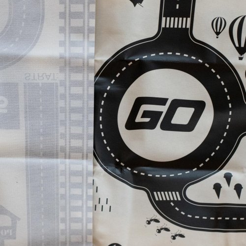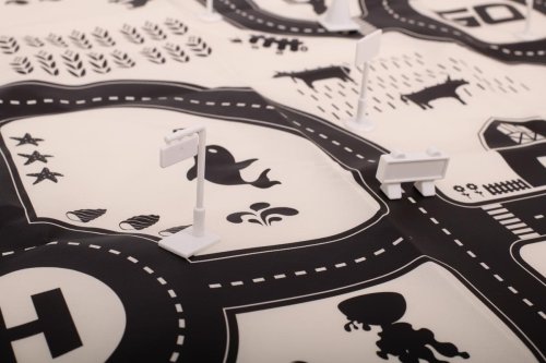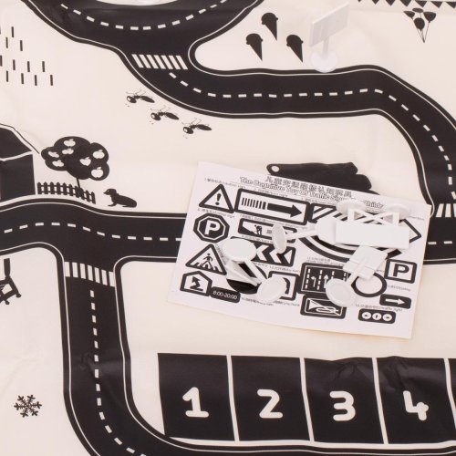 Vytvorte si vlastné mesto, umiestnite značky podľa vášho priania, farba podložky: krémová, čierna, hra na podložke bude skvelým úvodom do poznávania dopravných predpisov, vodeodolná, veľmi tenká a ľahká, vhodná na výlety, ľahko sa čistí vlhkou handričkou, pred hraním nalepte samolepky na značky, ľahké zloženie do kompaktných rozmerov.