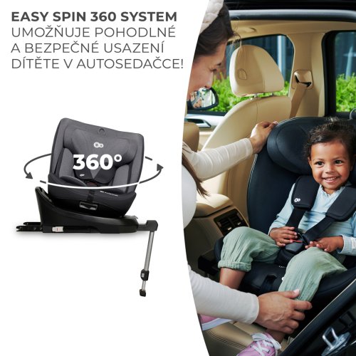 EASY SPIN SYSTEM 360 ° Systém EASY SPIN 360 ° uľahčuje nielen pripútanie dieťaťa do autosedačky pomocou vnútorných pásov. Umožňuje tiež rýchlu zmenu nastavenia (RWF a FWF) bez nutnosti vybratia celej autosedačky z vozidla. Jednoducho odistíte bezpečnostnú poistku a otočíte sedačku smerom k sebe, aby ste do nej mohli dieťa ľahko usadiť a pripútať, alebo otočiť sedačku v smere jazdy.