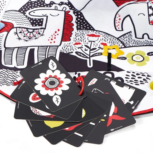 v sade je mnoho hračiek, ktoré rozvíjajú zmysly: 12 kontrastných kariet 4SMART, závesné zrkadlo, závesná loptička s hrkálkou, závesná šuštiaca hračka, senzorická loptička, plyšová hračka, farebné pásiky a hrkajúce guličky a zrkadlo, ktoré možno umiestniť pod fóliu.